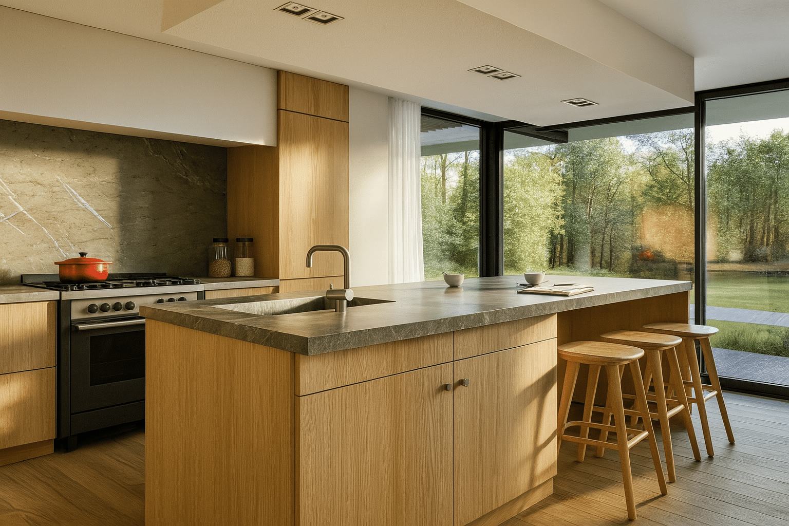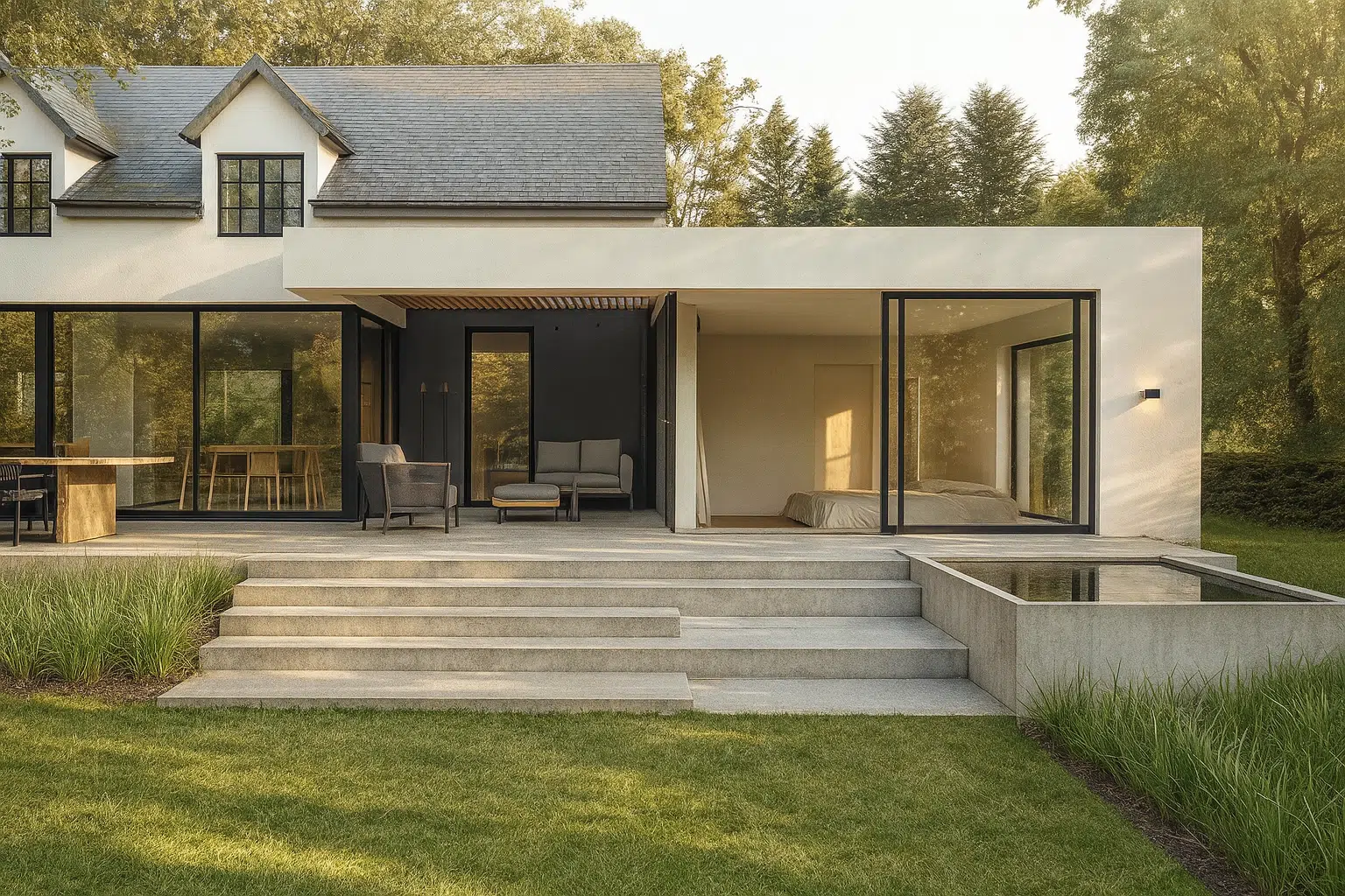 La réussite de la transformation tient dans la disparition subtile de la frontière entre la maison et le jardin. Grâce à de larges ouvertures et à un jeu de parois coulissantes, les espaces se prolongent naturellement vers l’extérieur. Des matériaux communs entre les parties anciennes et nouvelles ont permis de tisser une continuité architecturale homogène et intemporelle.